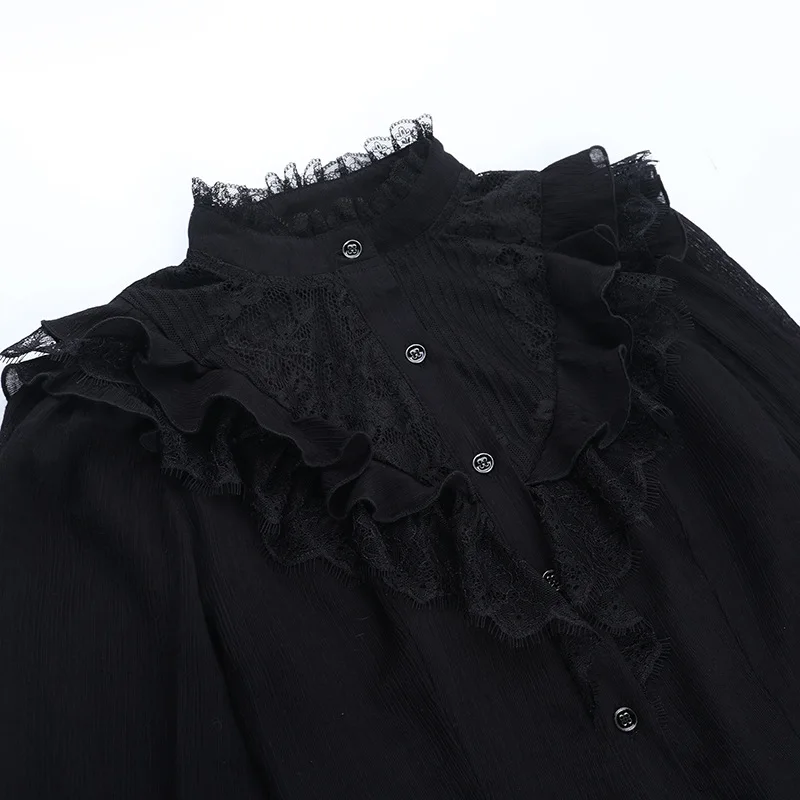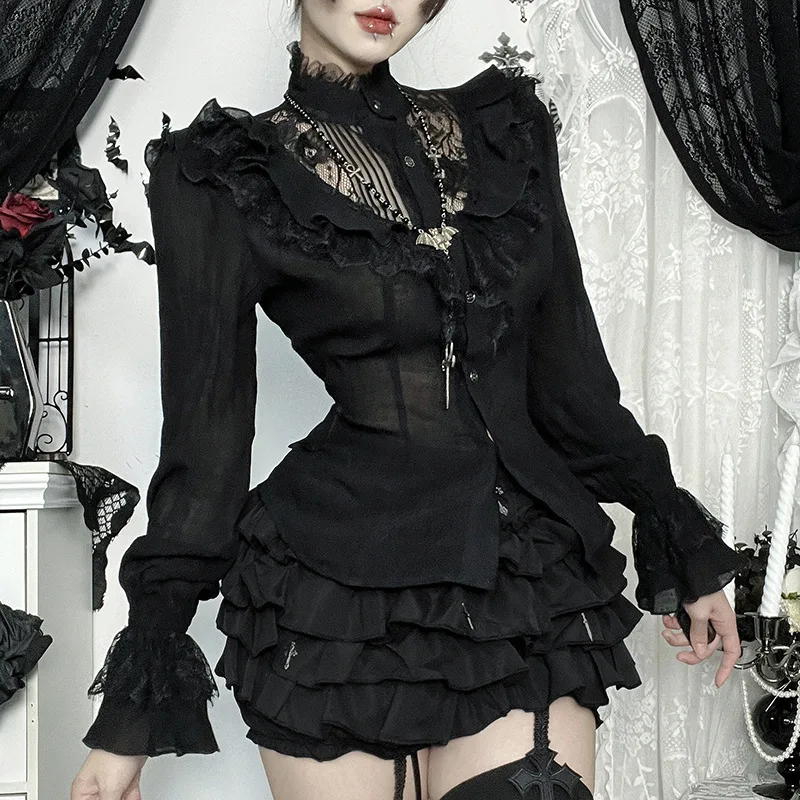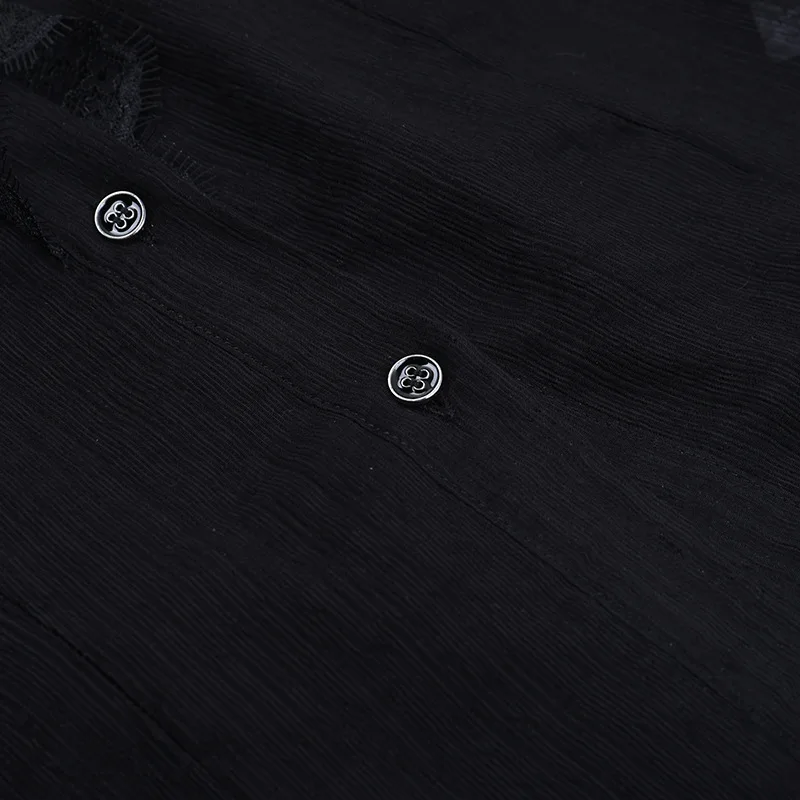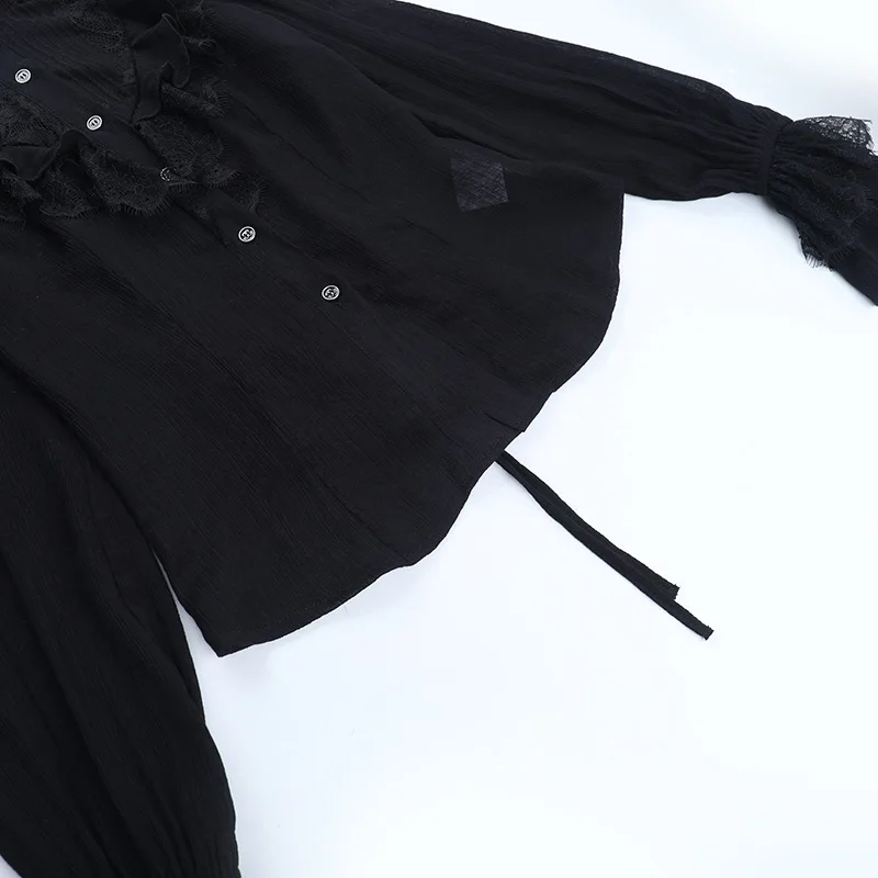 Accessories provide an effective way to personalize an outfit. The Goth Dark Lace Hollow Patchwork Shirt is suitable to be embellished with various accessories. Consider the incorporation of jewelry: a choker necklace or a delicate pendant can accent the neckline and enrich the gothic feel. Statement rings and bracelets containing dark precious stones (onyx, smoky quartz, and black diamonds) can create an atmosphere. A belt, especially one featuring metal embellishments or a unique buckle detail, can define the waist, contributing to the overall silhouette.