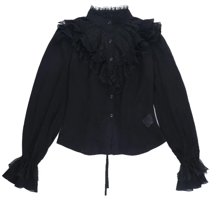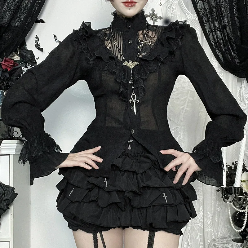 The shirt lends itself well to several gothic-focused styles. For a classic gothic appearance, it pairs effortlessly with a long, flowing black skirt, creating a unified silhouette that exemplifies gothic romanticism. Alternatively, the shirt can be combined with high-waisted, form-fitting black trousers or leather leggings to amplify the dark and edgy aesthetic. Pairing the shirt with boots creates a complete cohesive look.