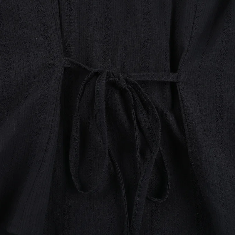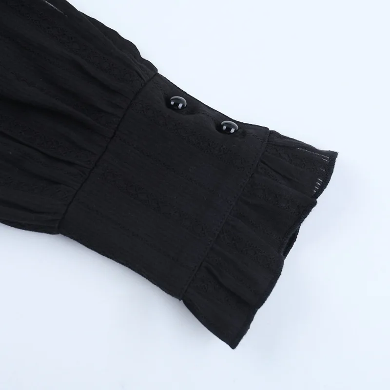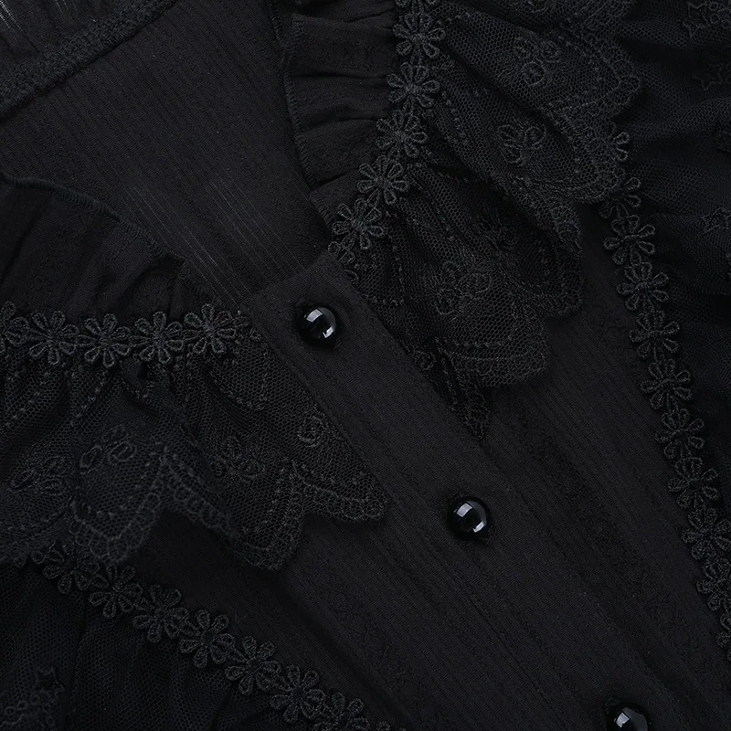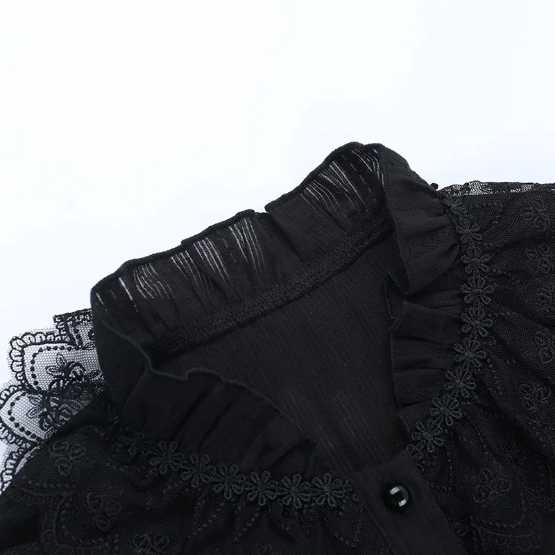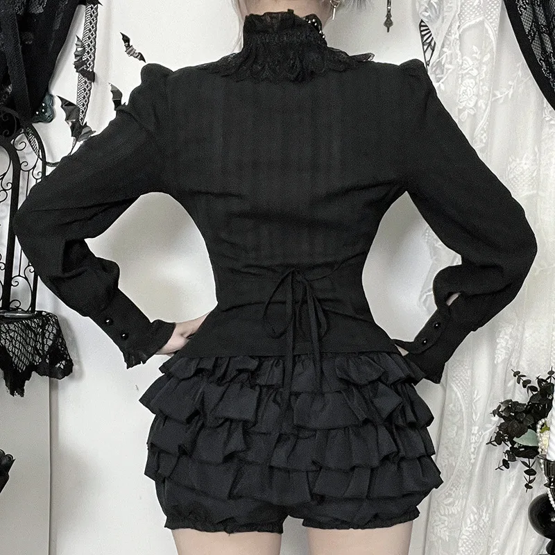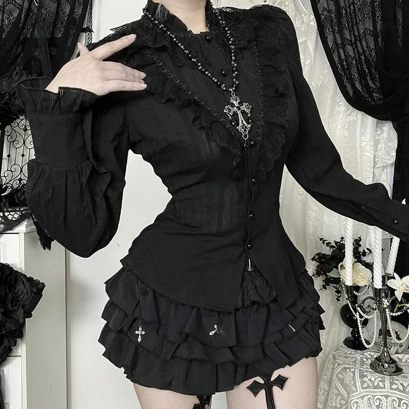 The Goth Dark Lace Trim Single-Breasted Blouse adds a refined gothic touch with its delicate lace details and textured long sleeves. Designed with a slim fit that flatters your shape, it’s perfect for Halloween looks, gothic parties, or everyday dark fashion. Pair it easily with skirts, leather pants, or accessories to complete your gothic aesthetic.