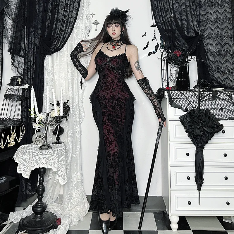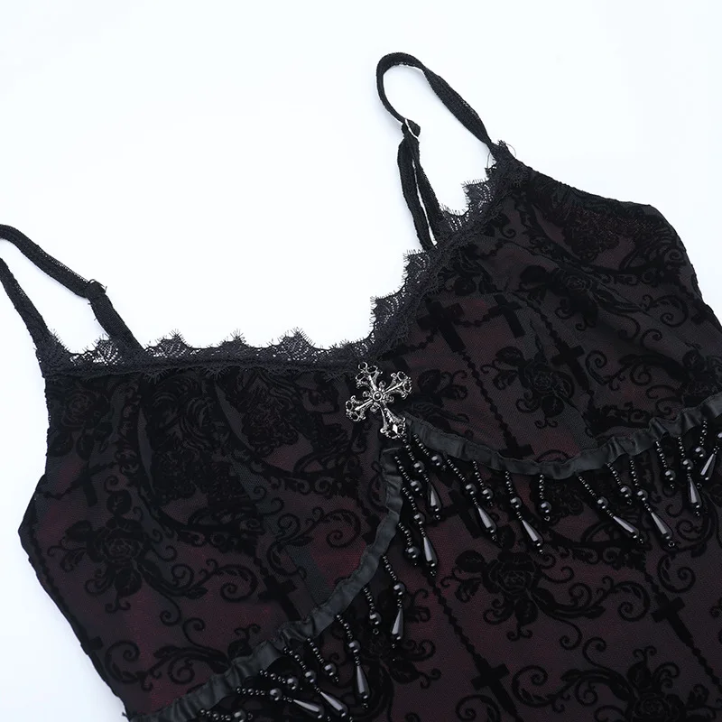 The Goth Dark Lace Trim Beaded Fringe Maxi Dress delivers a dramatic gothic vibe with its elegant lace details, sparkling bead accents, and flowing fringe design. The sleeveless cut and side split create a bold, flattering silhouette—perfect for Halloween events, gothic parties, or statement evening looks. Pair it with boots or dark accessories to elevate your gothic style effortlessly.
