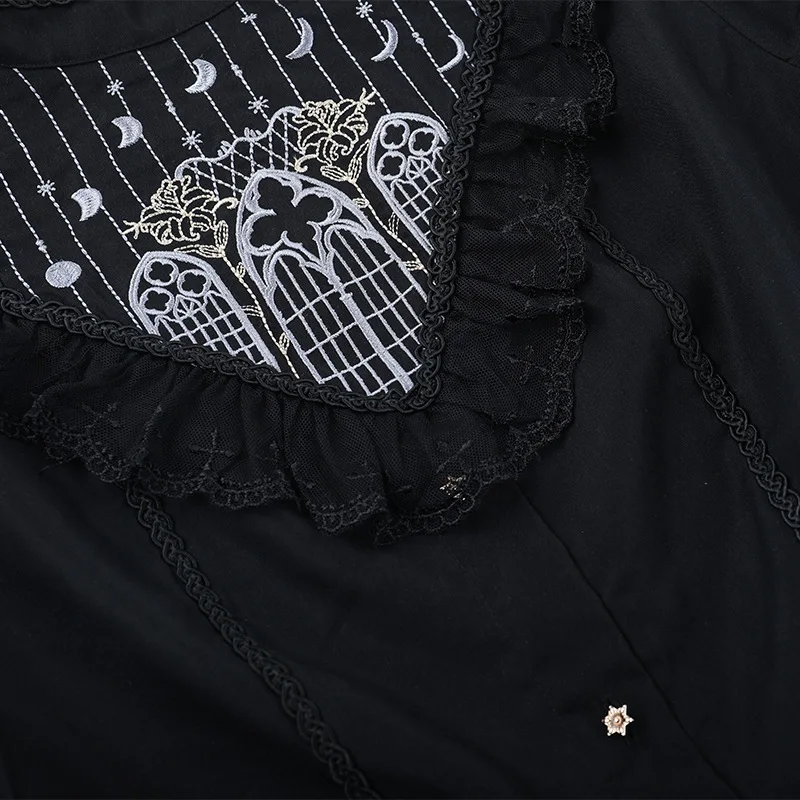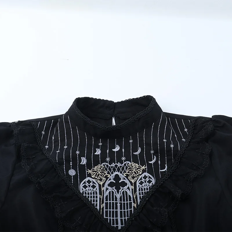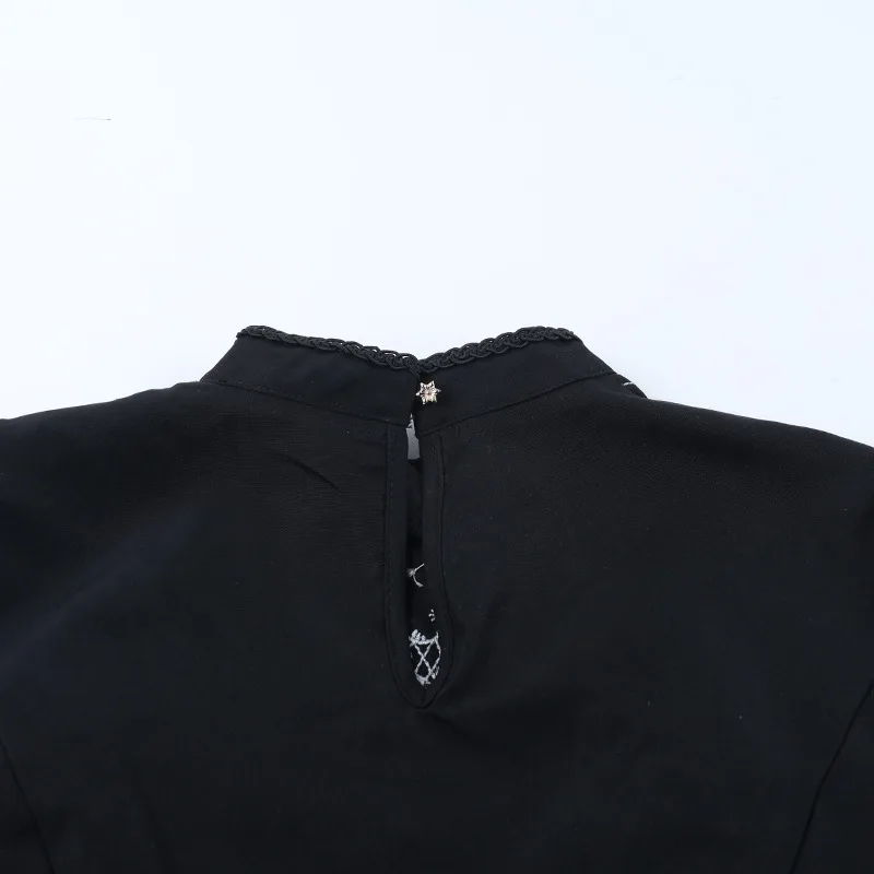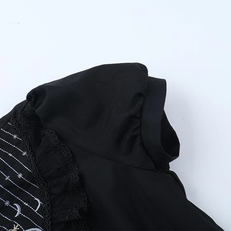 The Goth Dark Embroidered Lace Trim Top blends gothic elegance with modern Y2K edge. Featuring delicate embroidery, lace detailing, and chic puff sleeves, this slim-fit tee adds a refined dark aesthetic to any outfit. Perfect for alt fashion, Halloween looks, or everyday gothic streetwear—easy to pair with skirts, cargos, or layered accessories.